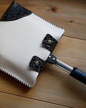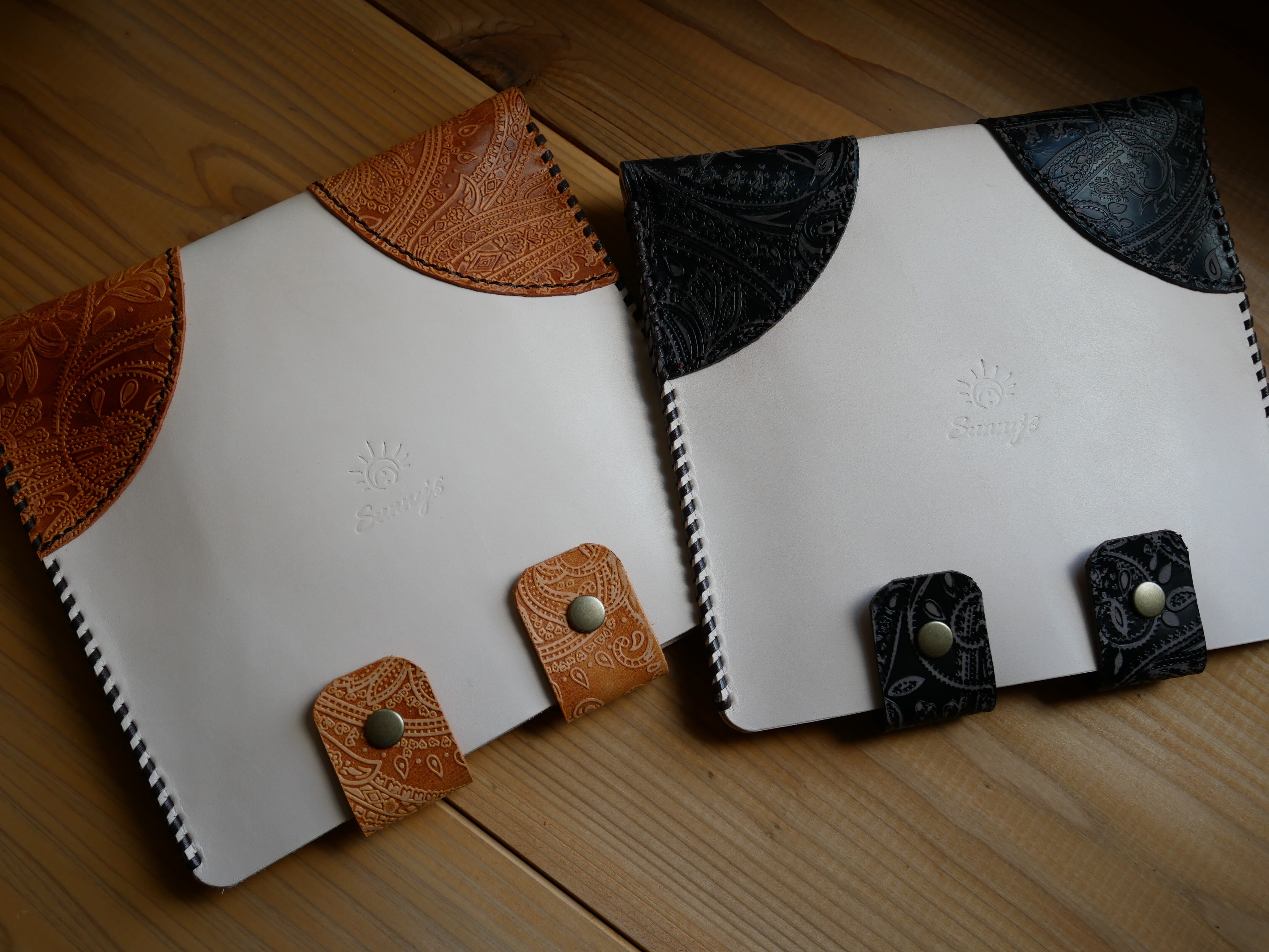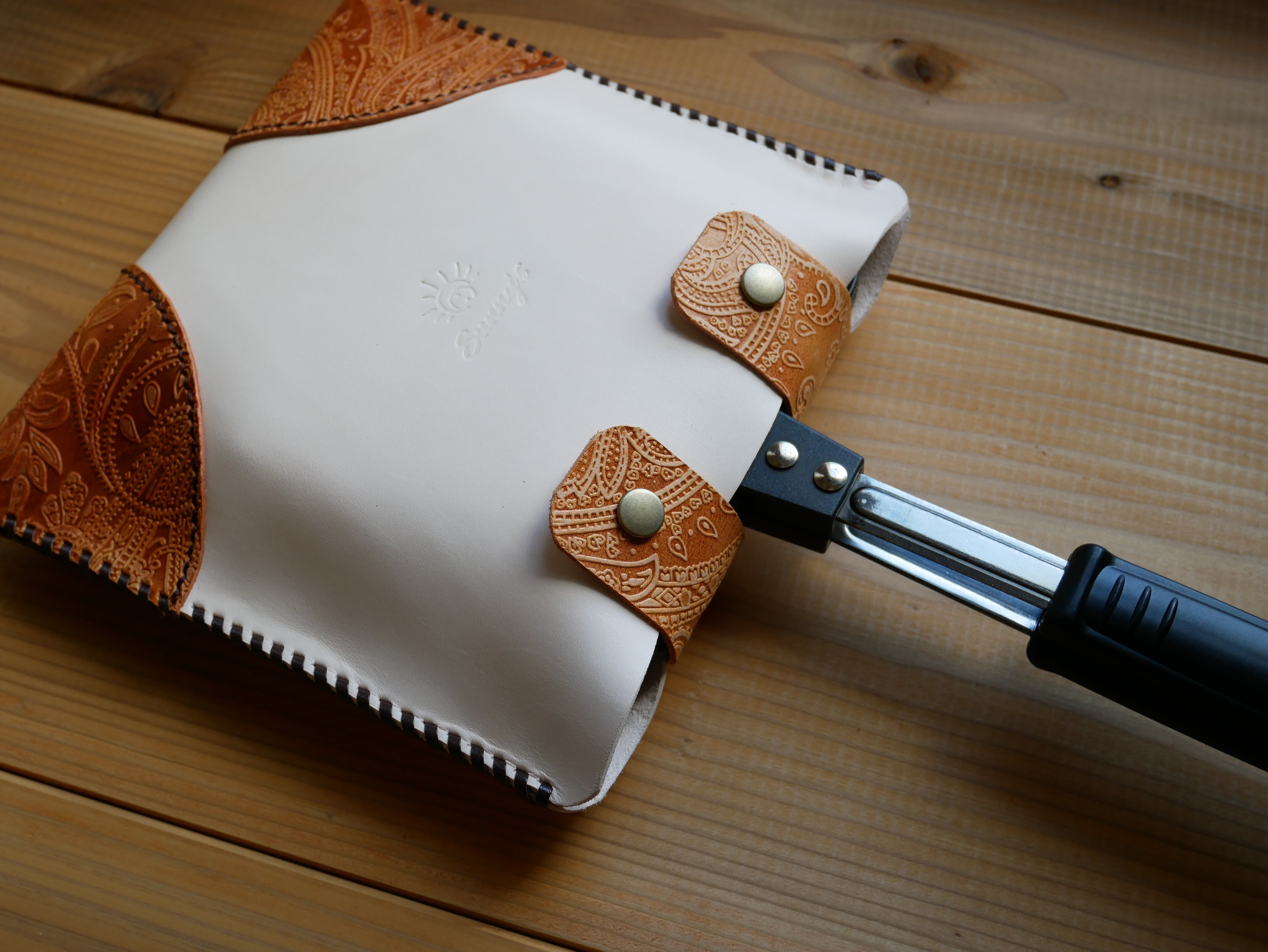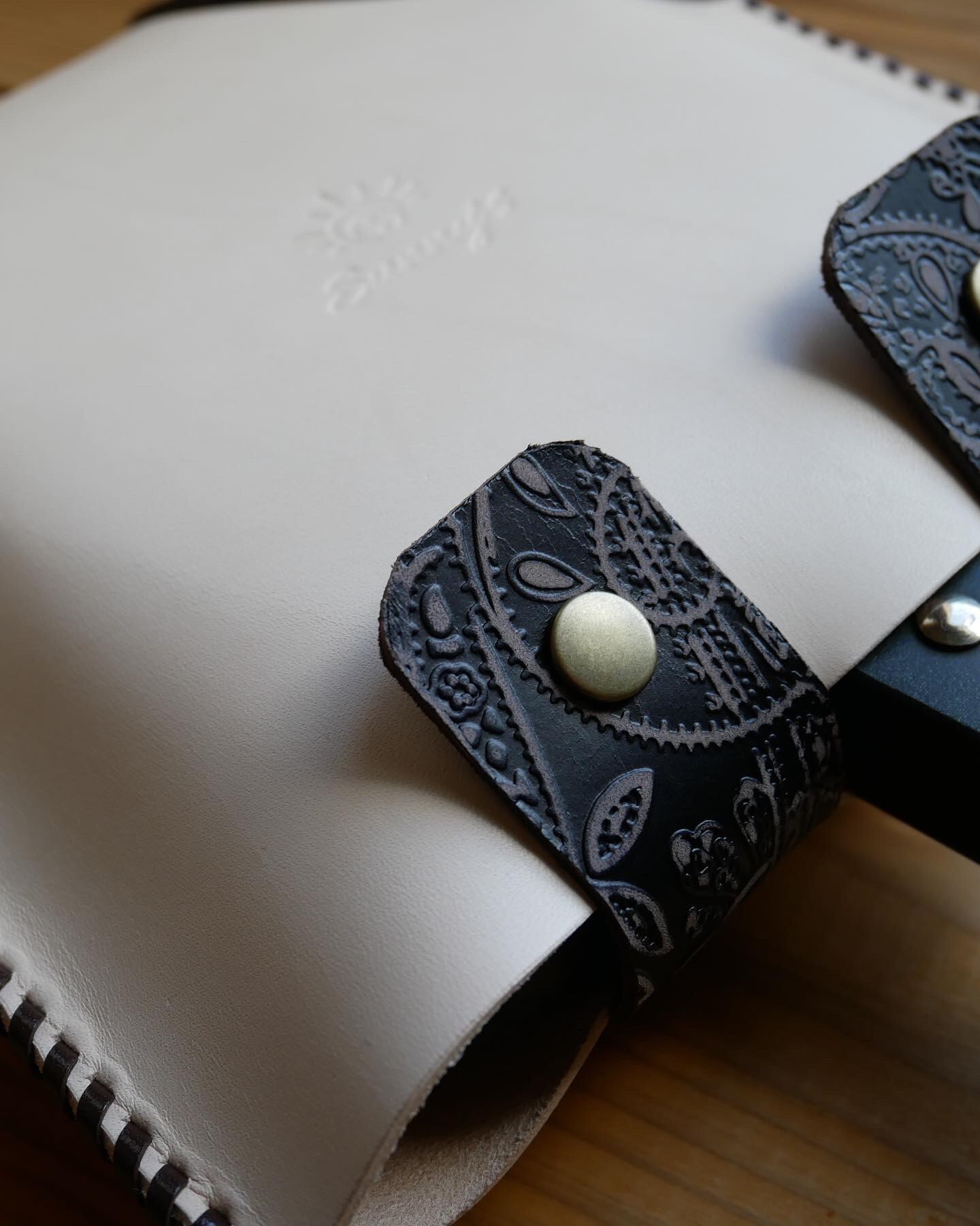 国産革にペイズリー柄を型押ししたレザーを使用しており、硬めの素材となっています。