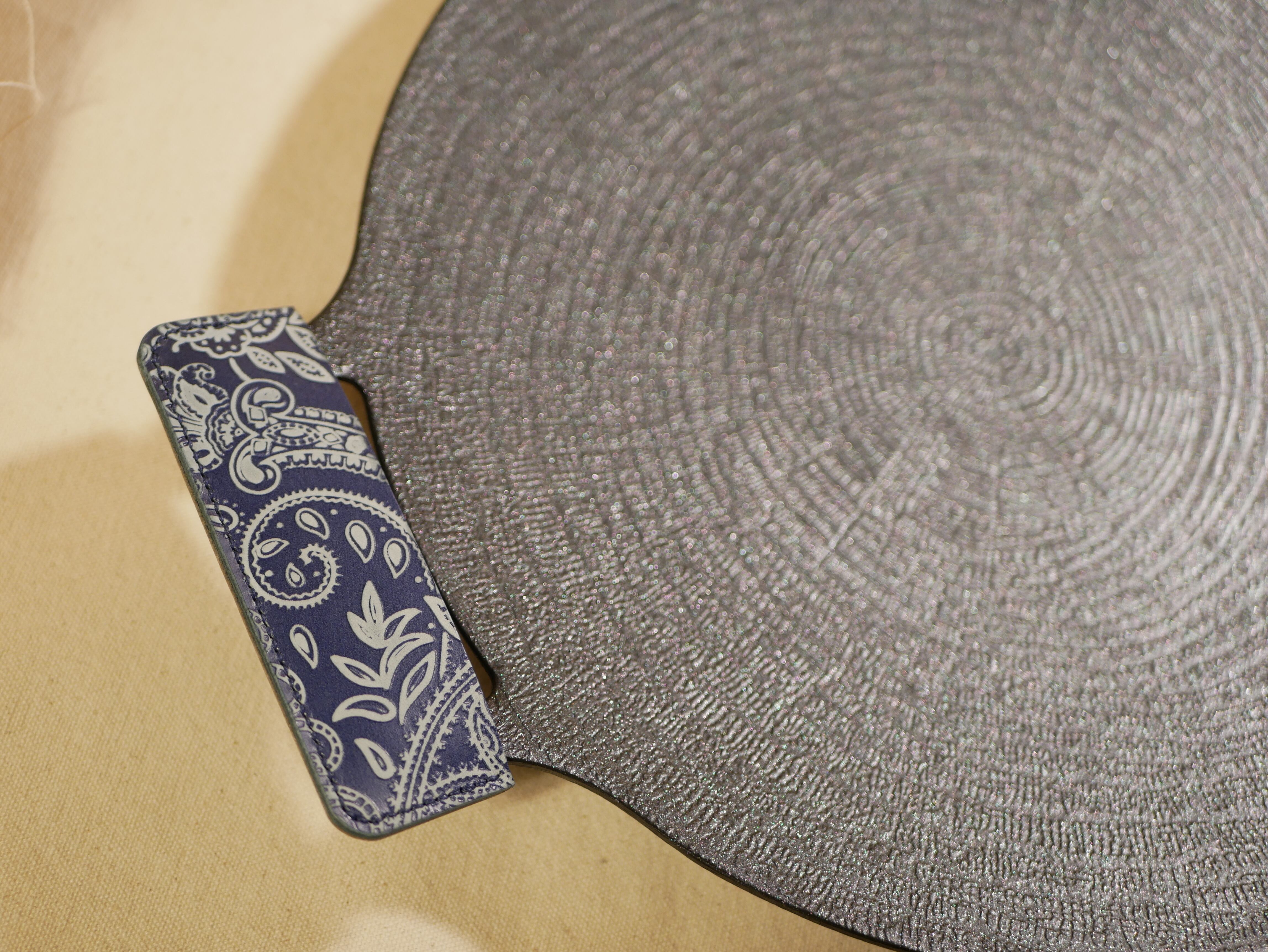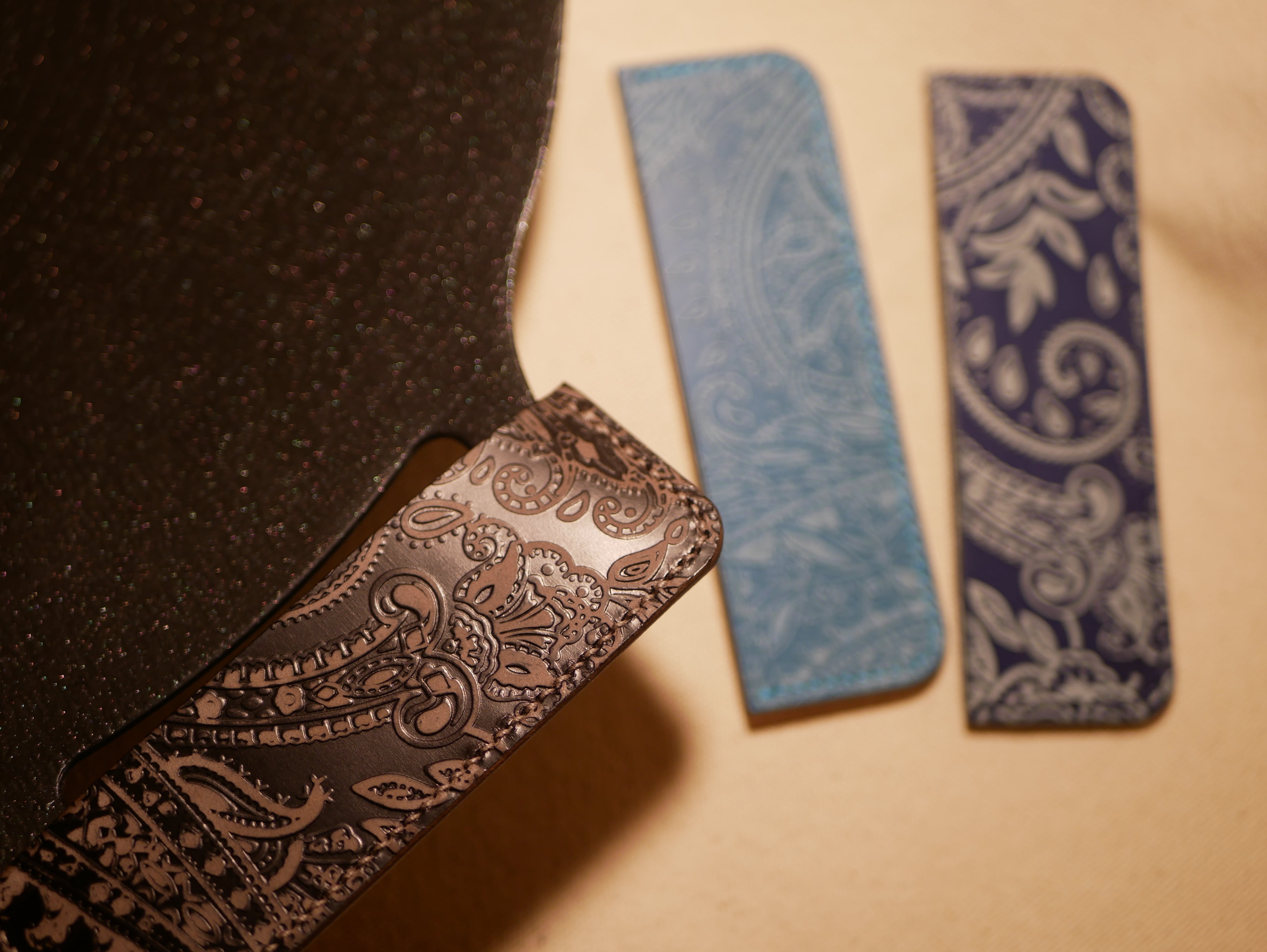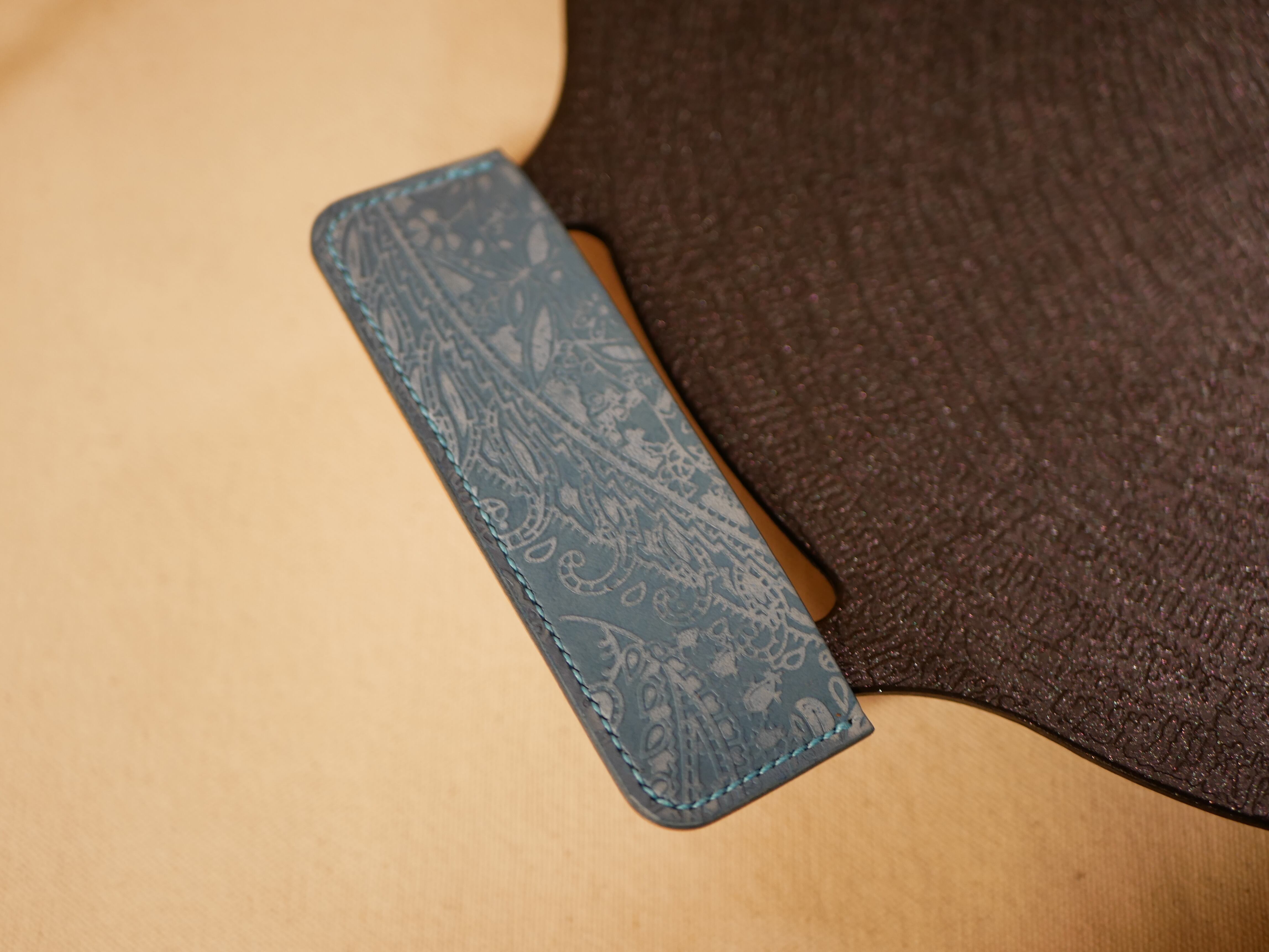 国産革にペイズリー柄を型押ししたレザーを使用しており、硬めの素材となっています。