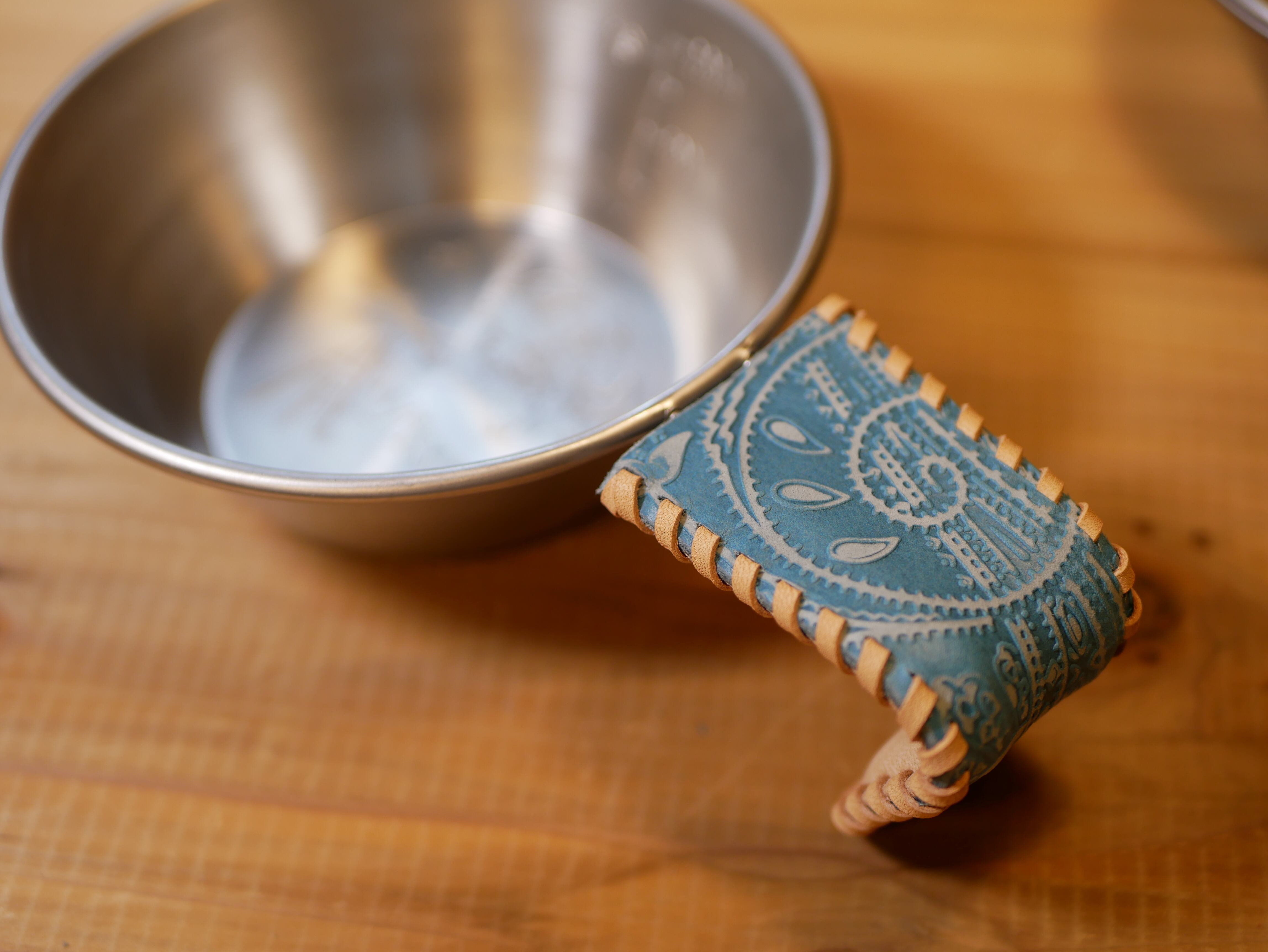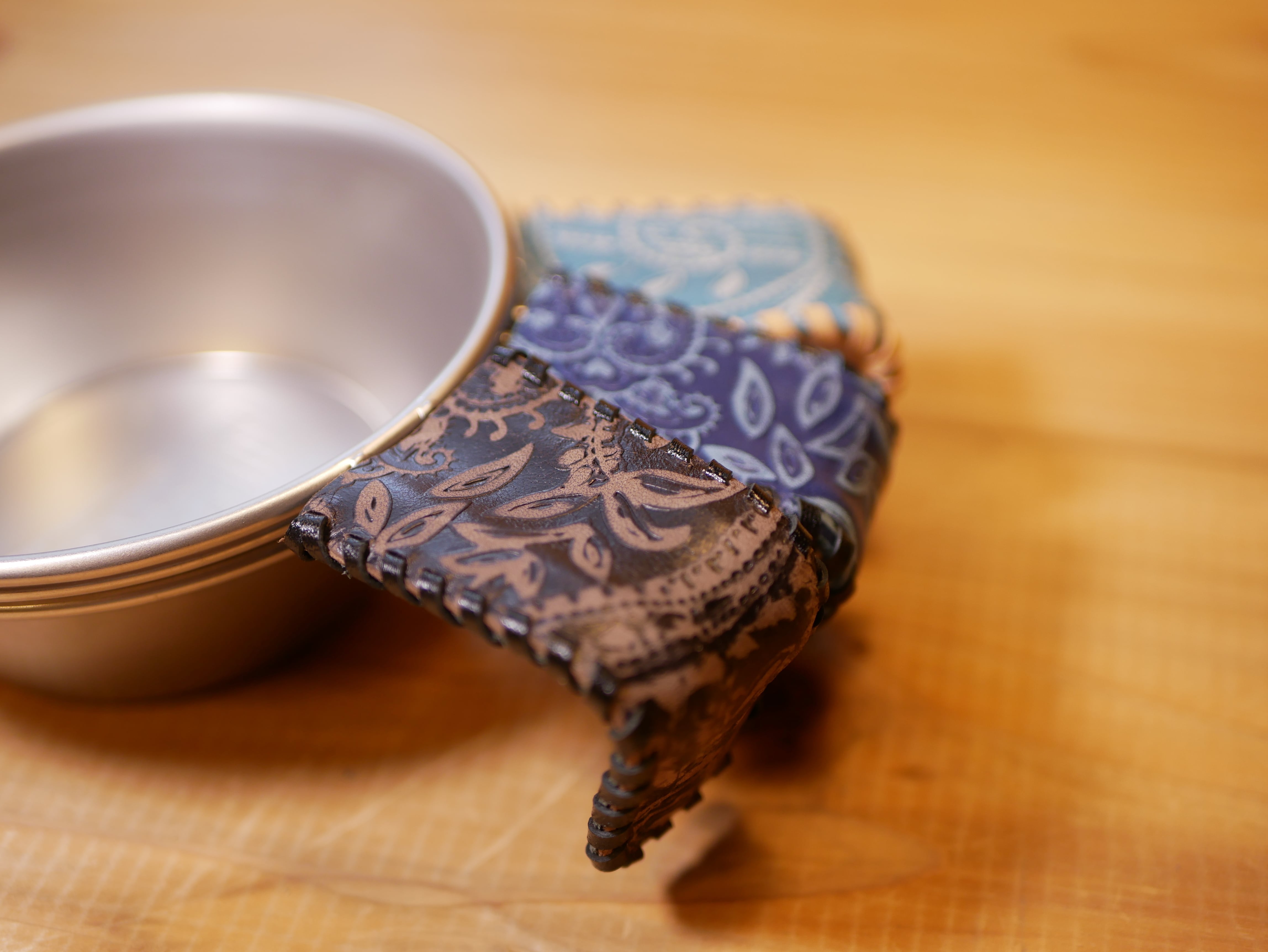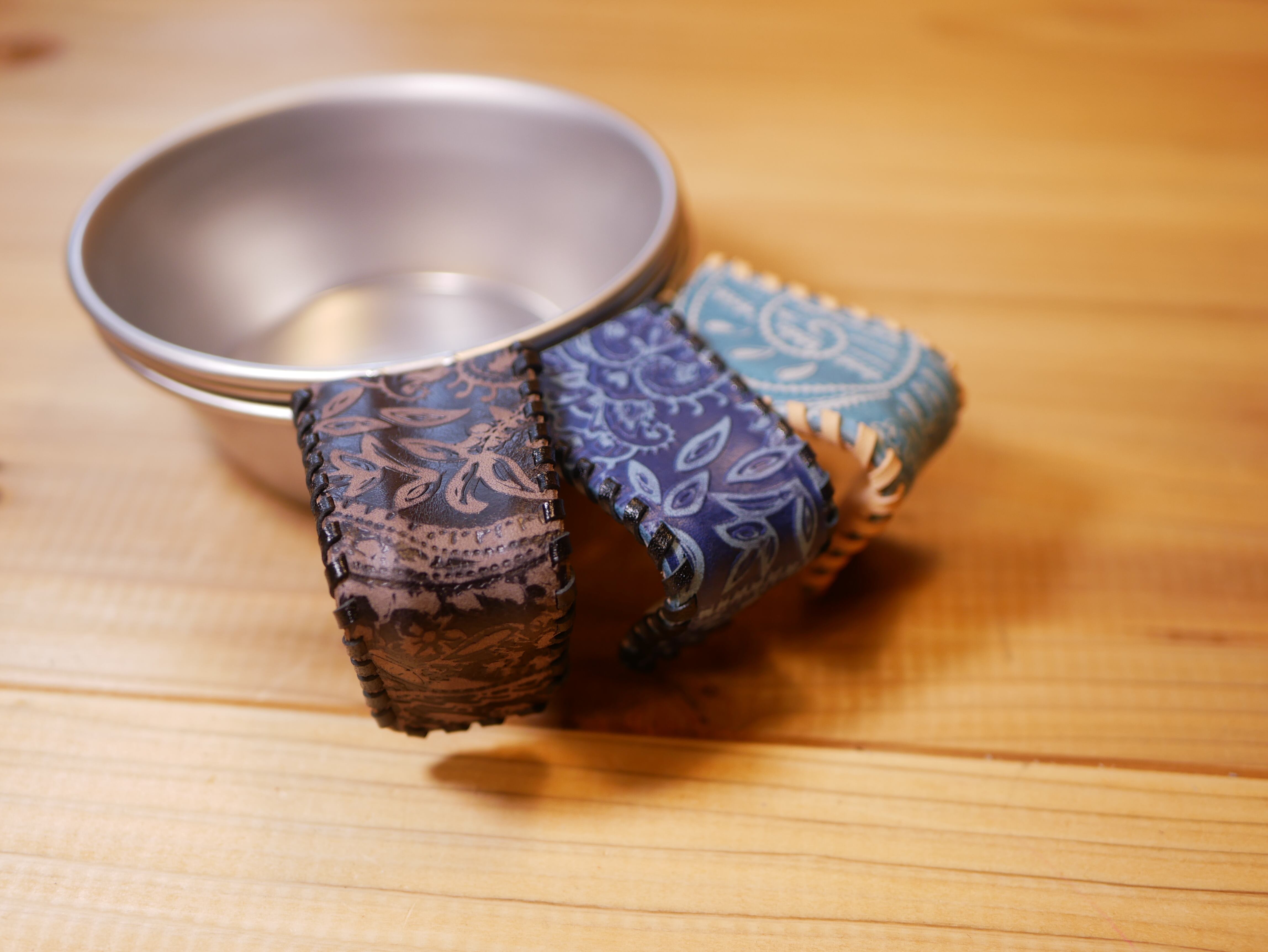 ペイズリー柄レザーで作成したシェラカップのハンドルカバーです。