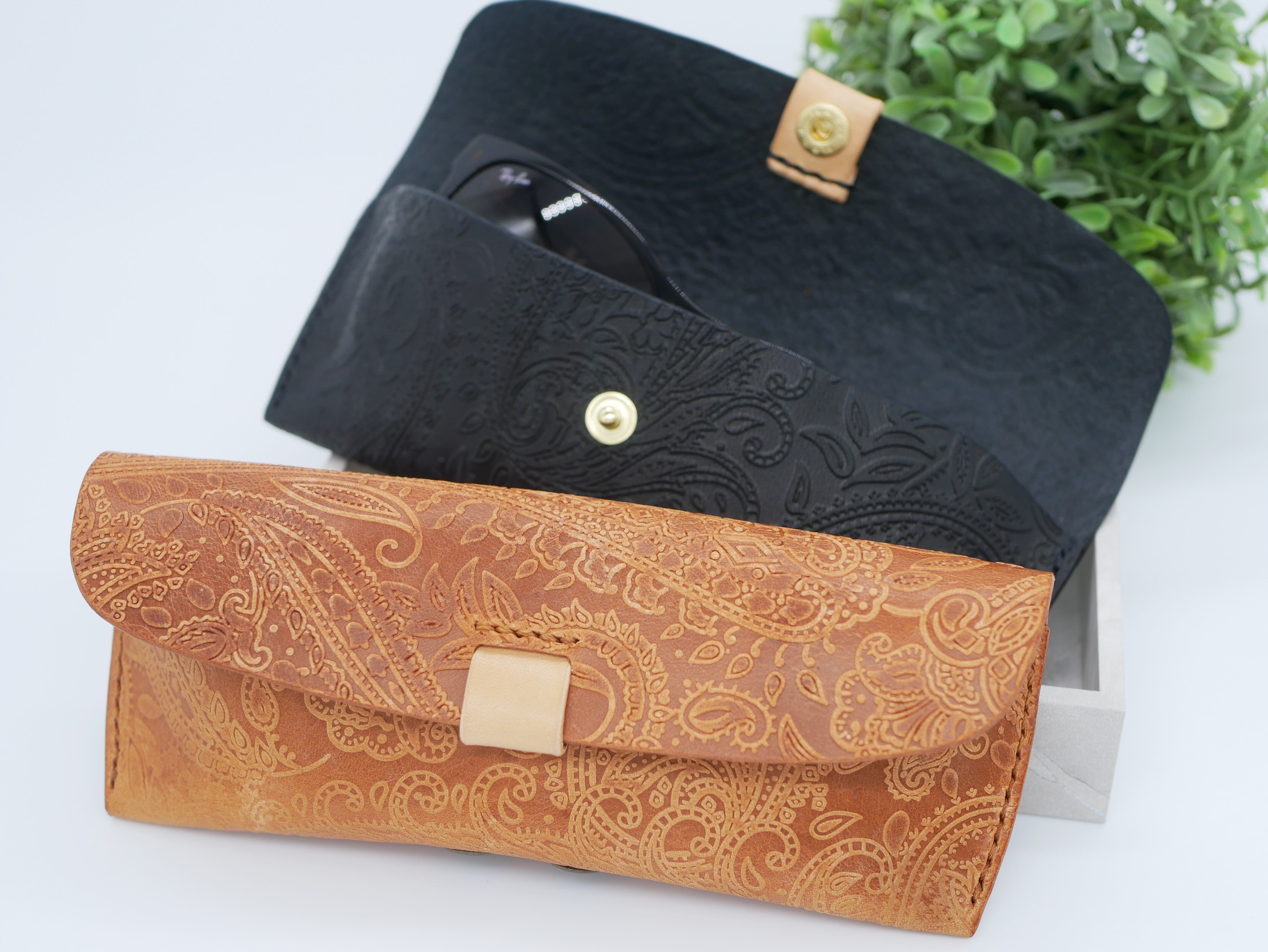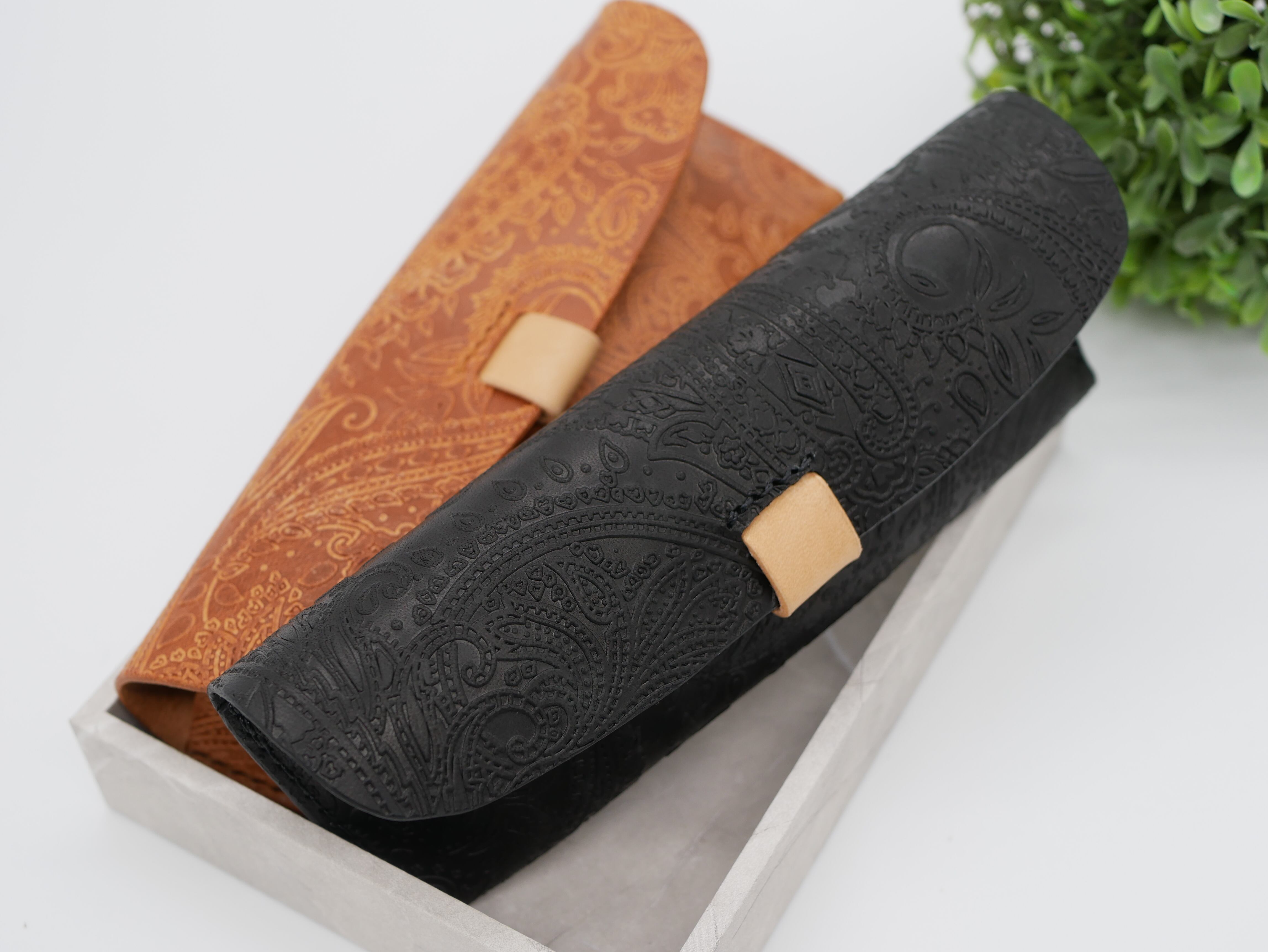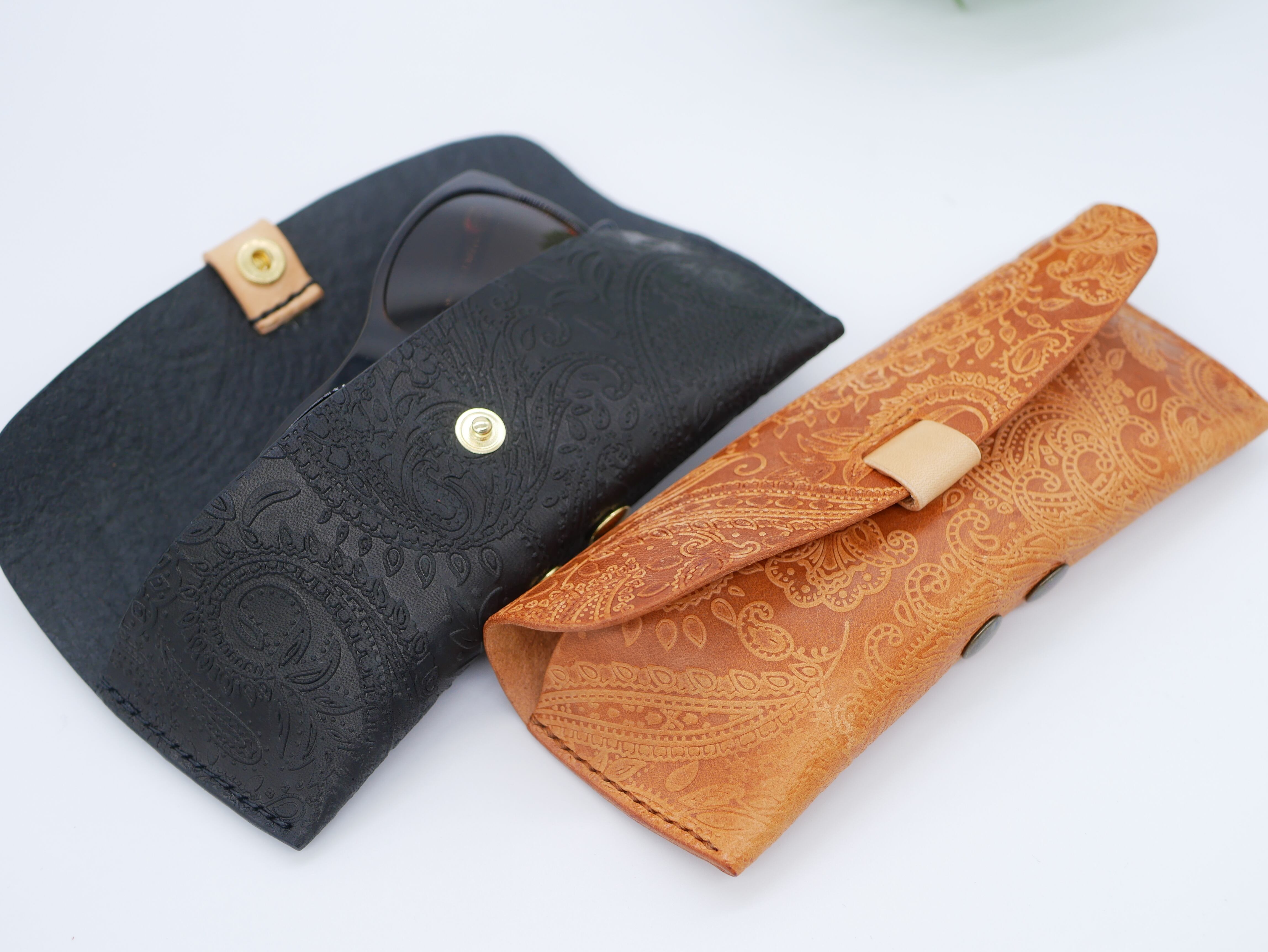 イタリアンレザーにペイズリー柄を型押しした素材を使用し仕立てました。ペイズリー柄が特徴的なデザインとなっております。中ではメガネがズレないようにストッパーがついています。