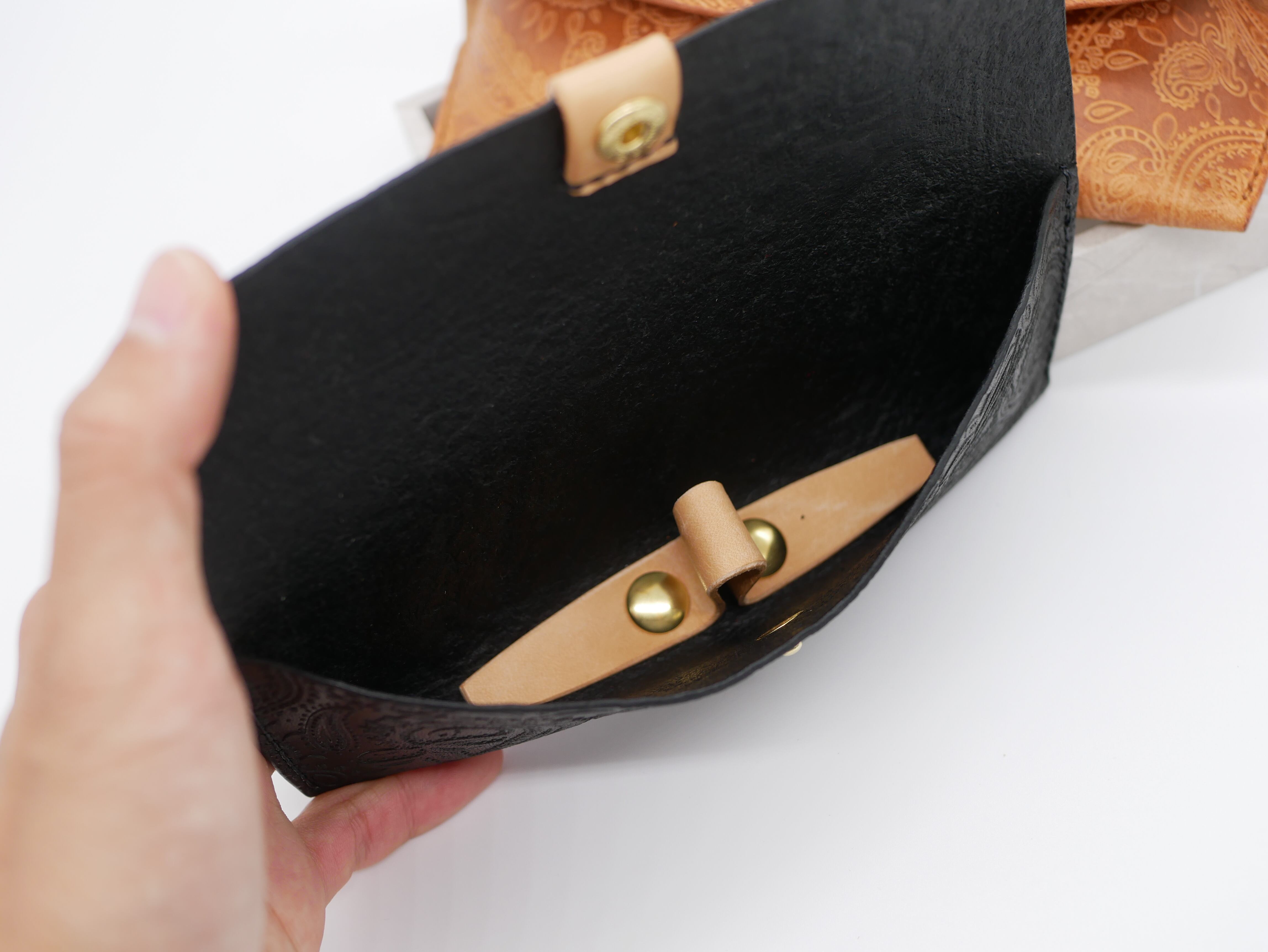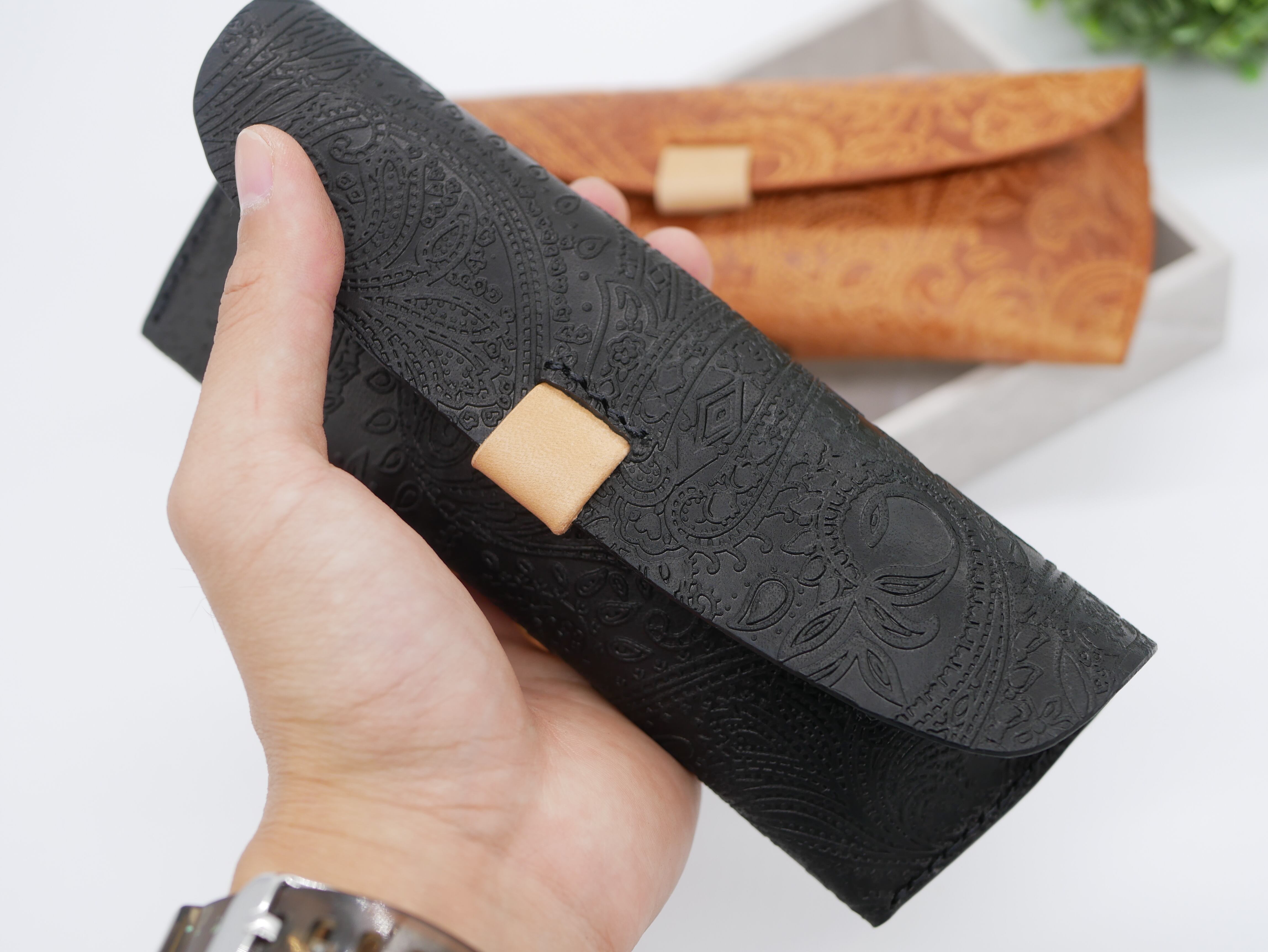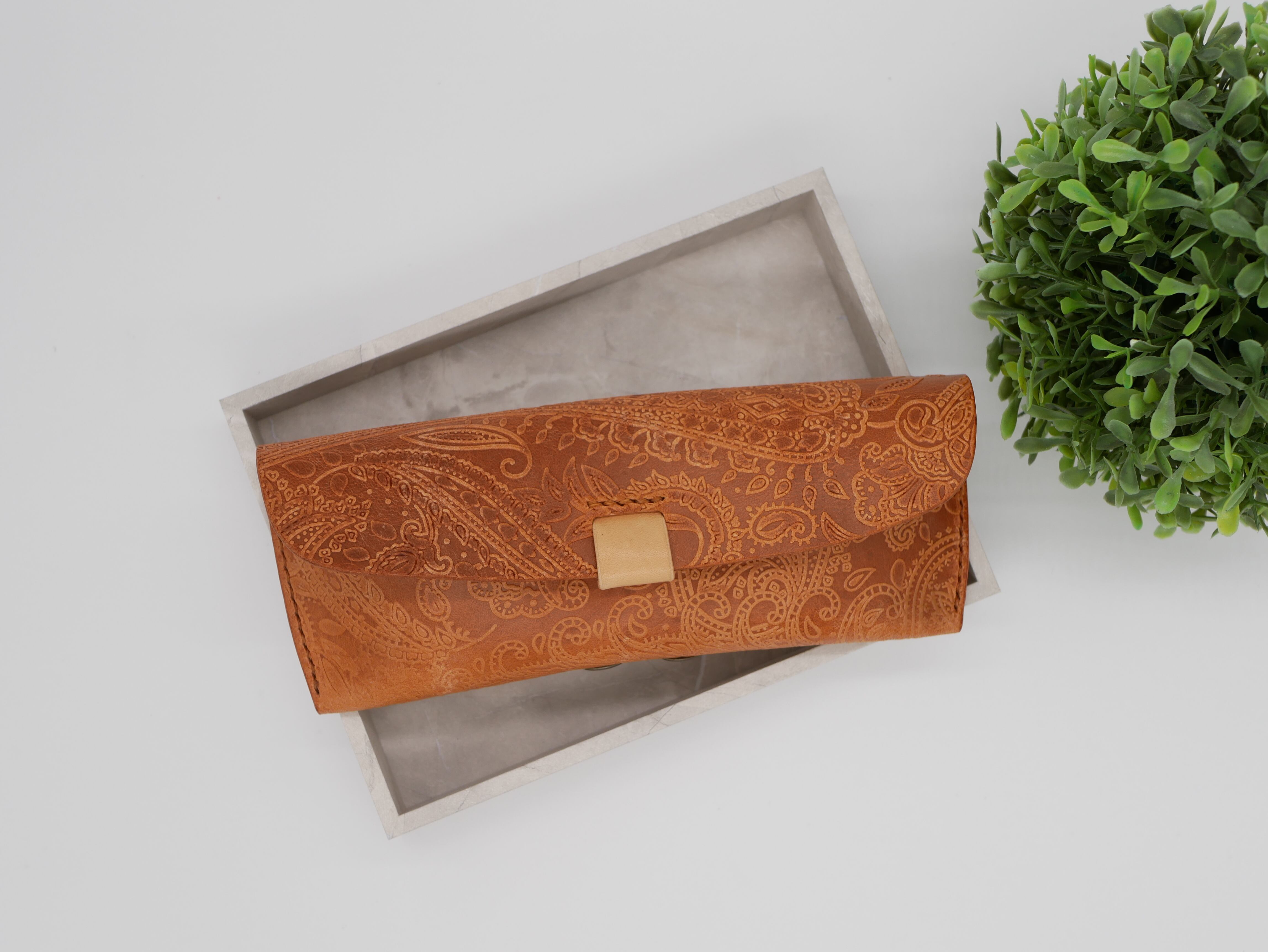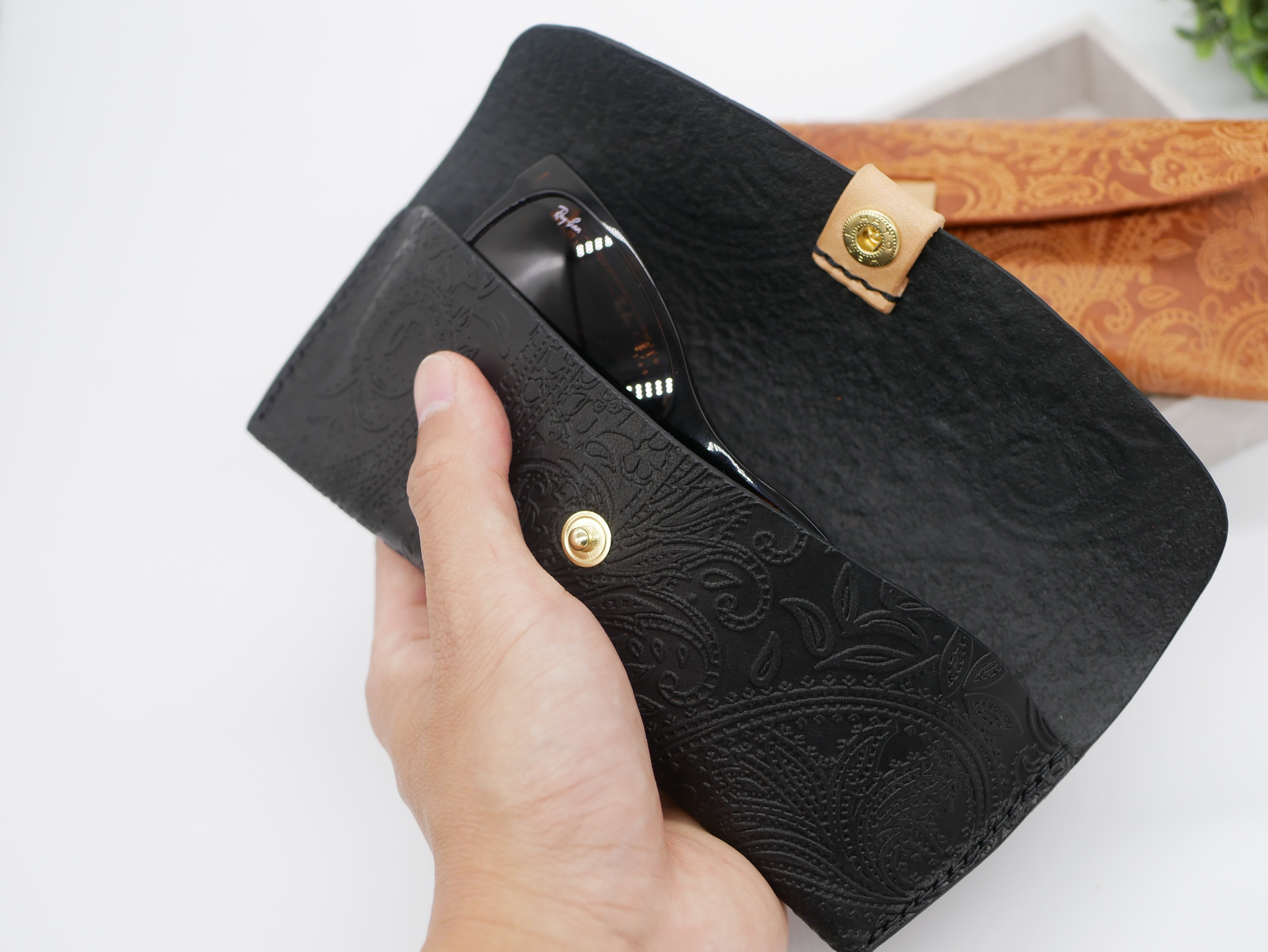 イタリアンレザーにペイズリー柄を型押しした素材を使用し仕立てました。ペイズリー柄が特徴的なデザインとなっております。中ではメガネがズレないようにストッパーがついています。
