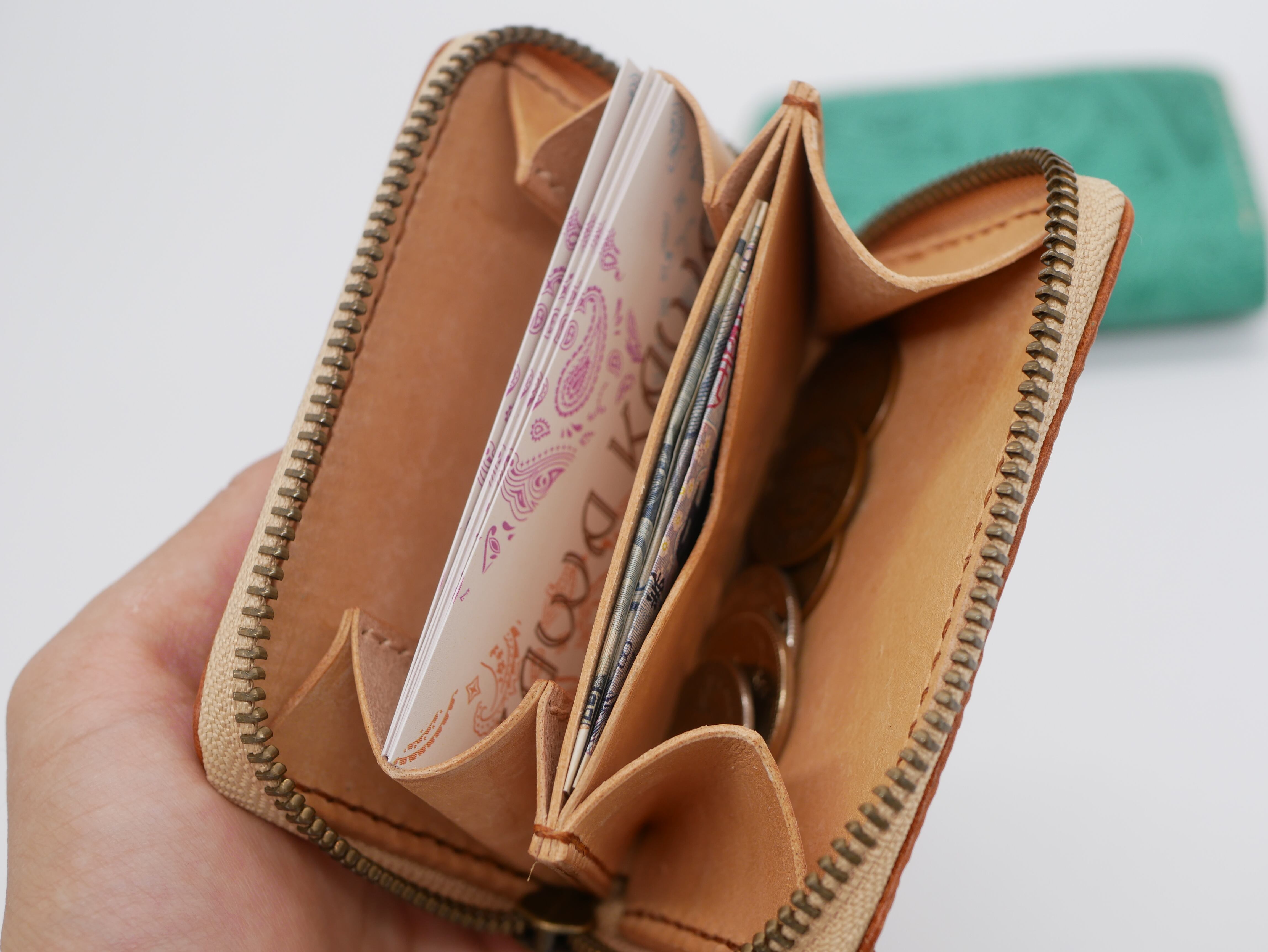 手のひらサイズのミニウォレットで必要最小限のお札・小銭・カードを収納可能です。