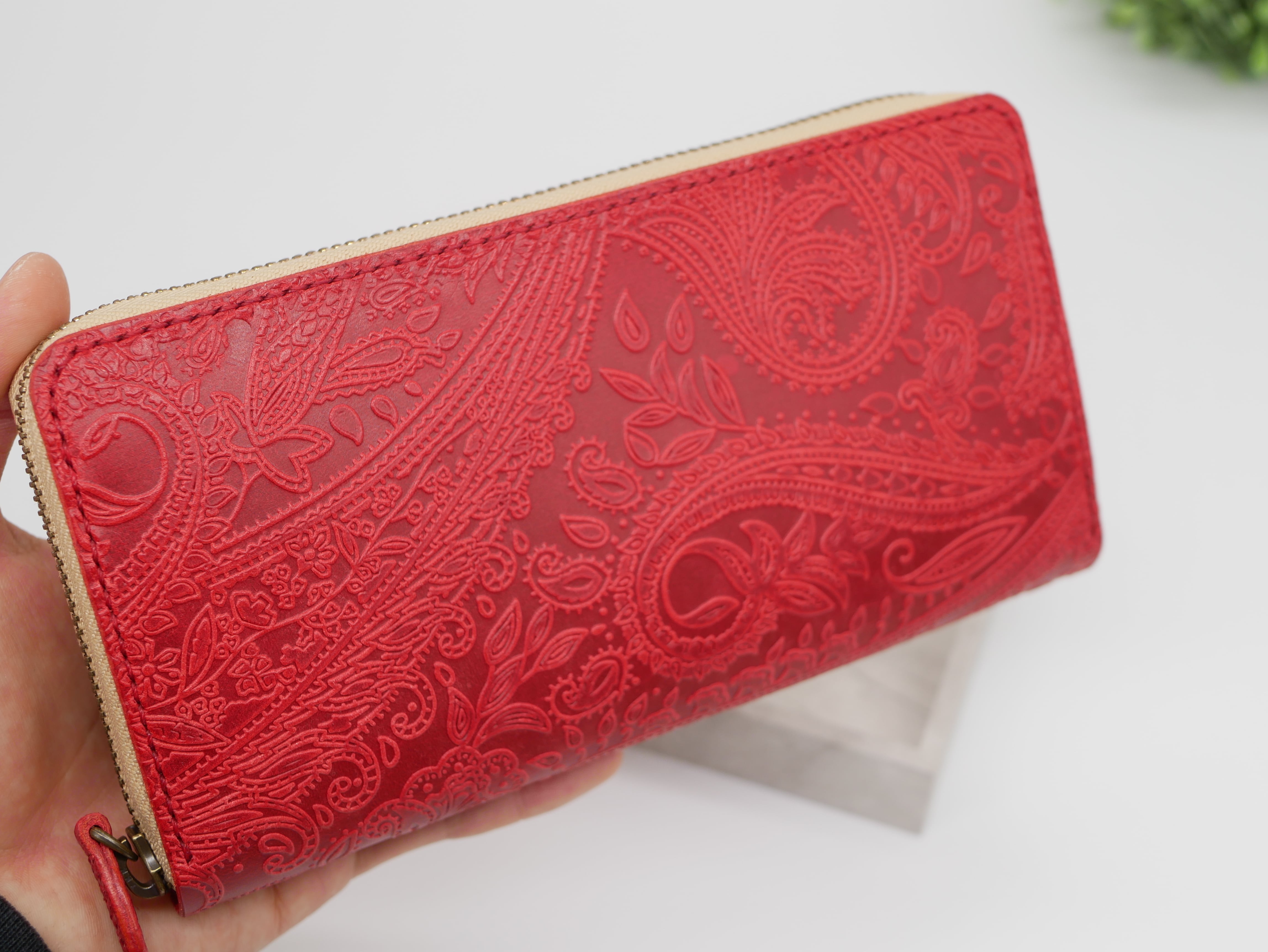 ペイズリー柄が美しいレザーのラウンドファスナー長財布です。手触りのよい上質なレザーを使用し、高級感ある仕上がりになっています。外側のデザインには、上品で落ち着いた色合いのペイズリー柄を使用。カード入れと小銭入れはシンプルな設計で機能性も抜群です。